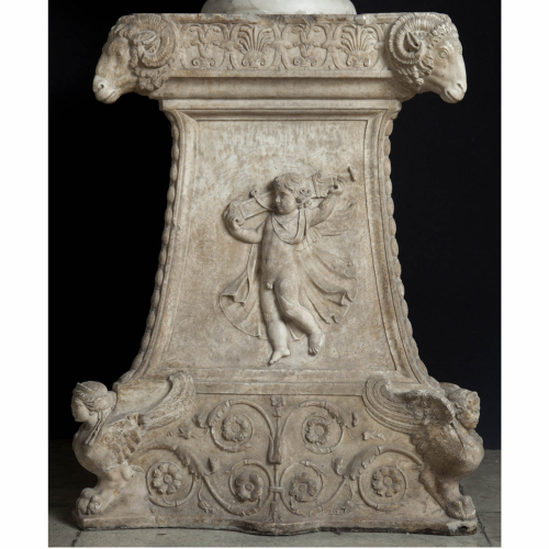 La base ha spigoli svasati e poggia su una sezione ornamentale ai cui angoli si indivuano sfingi greche. Esse hanno un viso pieno e delicato, racchiuso da un'acconciatura, che è trattenuta da un diadema e che si divide sulla fronte in due morbide bande laterali, tramite cui varie ciocche ondulate sono raccolte sul retro in uno chignon.