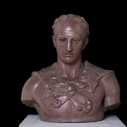 Il busto, tagliato sotto i pettorali, raffigura un giovane nudo, con spalle larghe e ampi pettorali. Il volto dallovale allungato, presenta una corona di alloro sopra la nuca perfettamente polita. Le orecchie sono finemente lavorate. Il viso, dalla fronte ampia, è caratterizzato da sopracciglia realistiche, occhi vuoti, dal contorno completamente marcato. Le guance sono piene ed i lineamenti morbidi. Lincavo tra il naso diritto e le labbra carnose, appena socchiuse è molto evidenziato. Il mento si presenta arrotondato. Al di sotto del forte collo, si trova la pelle leonina che dalle spalle scende sul petto, dove è annodata.