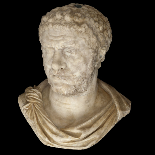 Il ritratto raffigura un uomo dall'aspetto maturo, il cui volto è piegato verso destra. Esso è caratterizzato dall'ampia fronte solcata da rughe, da arcate arcuate, con soppracciglia folte e spesse che quasi si congiungono sopra il setto nasale. Gli occhi sono grandi e intenti in una mesta riflessione che traspare attraverso l'iride e la pupilla incise e rivolte verso il basso. Il naso si apre in una punta ampia e appena schiacciata. La bocca, chiusa in un'espressione seria, è in parte coperta dai baffi, che si uniscono ad un'ispida barba.