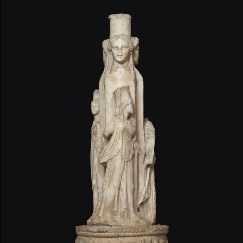 Le tre teste sono associate ad un unico polos e una sola erma attorno a cui girano tenendosi per mano tre fanciulle, dalle ampie vesti leggiadre, che portano sul capo un pesante kalathos.