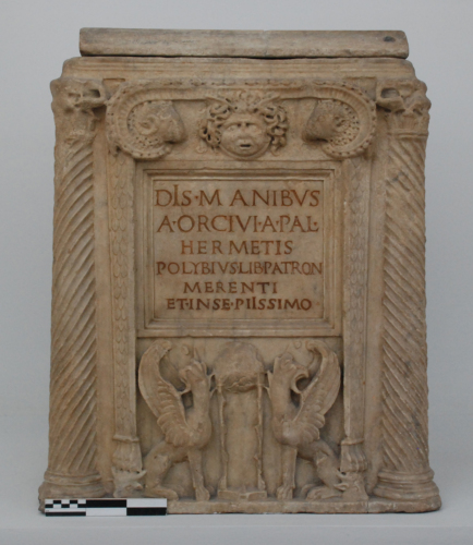 Altare cinerario di forma parallelepipeda quadrangolare, decorato sul lato frontale da due colonne tortili, con base attica e capitelli figurati con delfini, sopra i quali si sviluppa un architrave a tre fasce, piuttosto stilizzato. Sotto l'epistilio, un motivo a volute ornato da perline e bacelli, in cui due protomi d'ariete dal vello lavorato a trapano inquadrano un gorgoneion centrale. La Medusa, con le orbite oculari affossate, è raffigurata con serpi annodate sotto il mento e e capigliatura frastagliata da cui spunta un paio d'ali. Ai lati, due fasce embricate disposte su un piano obliquo, terminanti a zampe di felino, a loro volta collocate sopra bucefali. Al centro, una tabula incorniciata da un listello e da una gola rovescia, in cui è incisa un'iscrizione disposta su sei righe, con lettere dipinte all'interno in color ocra. Sotto la tabula, sul listello sottile della base, due grifi in posizione araldica di fronte a un tripode stante sopra una base a lati inflessi, sopra il quale è collocato un omphalos. Su ogni lato minore è raffigurato un albero d'alloro, con due coppie di uccellini. L'angolo posteriore dei lati minori è sottolineato da lesene scanalate, terminanti con capitelli analoghi a quelli presenti sulla fronte.