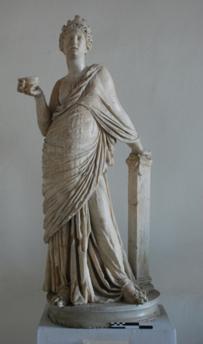 Statua di Musa, in posizione stante sopra un plinto modanato di forma ovale, con un impostazione elicoidale e piramidale, ritratta nell'atto di appoggiarsi con la mano sinistra a un pilastrino parallelepipedo, modanato alla base e impreziosito da un piccolo drappeggio alla sommità, mentre con il braccio destro, piegato, regge una piccola patera rivolta con la mano verso l'alto. La testa, cinta da un alto diadema, è incorniciata da una pettinatura a scriminatura mediana da cui si dipartono ciocche a capelli ondulati raccolti sulla nuca e ha lo sguardo rivolto verso l'alto. La Musa indossa un chitone che corre trasversalmente sul petto, con un ricco panneggio che a pieghe con spigoli acuti, articolate in forma ellissoidale nella zona mediana, alterna grosse pieghe verticali che si allargano alla base con ricchi strascichi. Sopra, un mantello avvolge delicatamente la figura quasi per intero, con un rotolo di stoffa che attraversa diagonalmente il petto, lasciando intravedere con preziosi giochi di trasparenza le parti sottostanti.