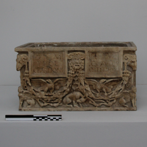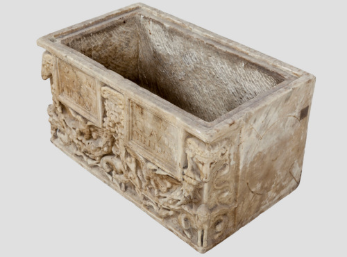 L'urna a cassetta è priva del coperchio. Sulle pareti del reperto sono state realizzati a trapano ed a scalpello dei rilievi che raffigurano festoni di fiori e foglie, che circondano due tabulae inscritte. Al di sotto di queste vi sono due aquile ad ali spiegate, mentre al centro in basso si rileva la presenza di una lupa che allatta un bambino. In angolo si notano delle protomi di ariete al di sopra di sfingi sedute. Al centro, tra le tabulae, vi è una testa di Giove Ammone, raffigurato con le consuete corna d'ariete.