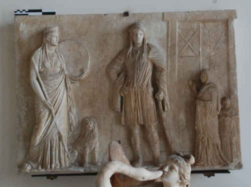 Rilievo votivo privo di cornice e con un bordo lievemente aggettante lungo il margine inferiore, che funge da base alla scena, divisa verticalmente in tre parti dalle figure che la compongono: a sinistra, la dea Cibele, affiancata dal leone, al centro Attis, entrambi resi con proporzioni imponenti, mentre a destra del rilievo, in dimensioni più ridotte, un'offerente seguita dall'ancella davanti all'entrata di un edificio, probabilmente il tempio dedicato a Cibele e Attis.