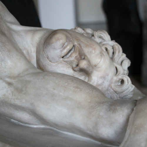 La scultura ritrae un uomo, che giace morto su di un terreno sassoso ed accidentato: egli è disteso sul suo scudo, mentre stringe ancora in mano una spada spezzata. Le testa è riversa indietro, con i capelli scomposti ed il viso dagli occhi chiusi e labbra spalancate nell'ultima espressione che aveva colpito l'uomo prima del trapasso. Sul corpo si notano tagli e ferite da cui fuoriesce del sangue rappreso. Le gambe, la sinistra piegata e la destra distesa, sono tese, con le muscolature in evidenza, nell'ultimo spasmo avuto prima della morte.
