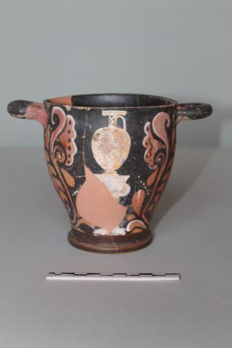 Skyphos con corpo a profilo ovoidale teso, labbro indistinto assottigliato e piede a disco con taglio obliquo arrotondato. Le anse contrapposte a bastoncello appiattito e sono impostate orizzontalmente subito al di sotto dell'orlo. Il decoro dipinto è racchiuso entro fiori campanulati e palmette. In A è presente una hydria posta su di una colonnina terminante in un capitello modanato mentre in B è raffigurata una colonna con capitello a volute; entrambi i decori sono sovraddipinti in bianco-giallo.