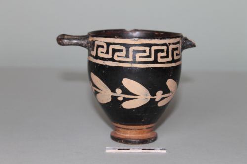 Skyphos con corpo a profilo ovoidale teso, labbro indistinto assottigliato e piede a disco distinto con taglio obliquo arrotondato. Le anse contrapposte, di cui una è andata perduta, sono insellate, presentano una sezione a bastoncello appiattito e sono impostate orizzontalmente subito al di sotto dell'orlo. Il decoro dipinto, che interessa la parte centrale del corpo, è costituito da una sequenza di foglie lanceolate a rappresentare una corona d'alloro, delimitata superiormente su un lato da una cornice con "greca", dall'altro da una fascia "a scaletta".