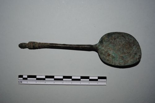 Cucchiaio con conca profonda di forma ovale. Manico angolato a sezione ovale terminante in sei fascette accostate, di cui le due finali più larghe, e in una pigna consunta.
