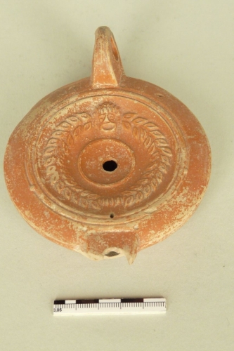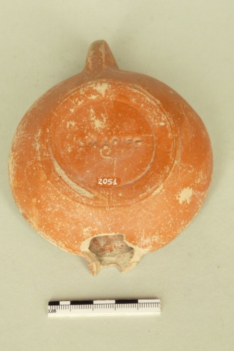 Lucerna in argilla beige con vernice rossa. La lucerna presenta un becco (frammentato) separato dal disco da una linea orizzontale e due punti impressi (tipo Loeschcke VIII, L1); sul disco, entro due cerchi, una corona di foglie ovali fermata da una maschera. Sul fondo, entro due cerchi, è stampigliato il monogramma L.M(unatus) Adiec(tus).