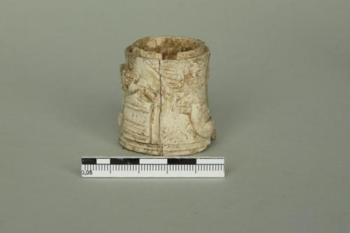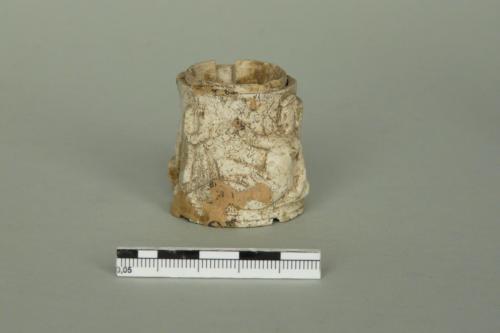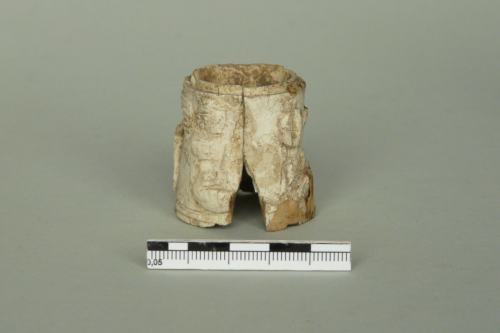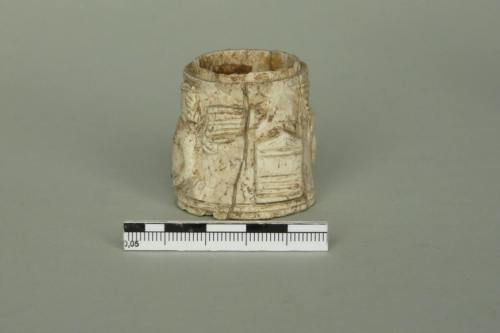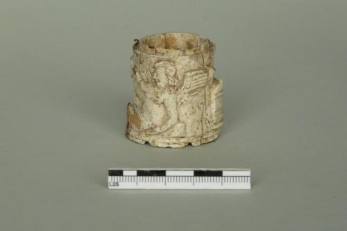 si tratta probabilmente di un elemento cilindrico decorato che ornava un piede di letto; non convince l'identificazione con una pisside priva di fondo (Museo 1993) poiché il cilindro è finito da entrambe i lati e presenta una caratteristica forma leggermente rastremata. La cronologia proposta dsi basa sull'arco di tempo di maggiore diffusione dei letti in osso in età romana. Esistono anche esemplari più tardi e l'analisi stilistica dei volti degli eroti porterebbe a ipotizzare una cronologia più bassa. Un'analisi generale dei letti in osso e avorio di età romana è in Bianchi 2010, con ampia bibliografia