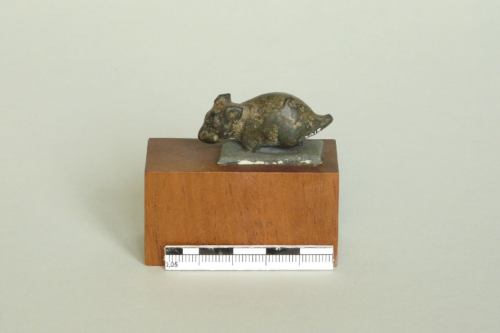 topolino ritto sulle zampe, con orecchie appuntite e muso arrotondato; corpo informe da cui partono le zampe poco caratterizzate. La statuetta è stata fissata a una base non pertinente in posizione stante