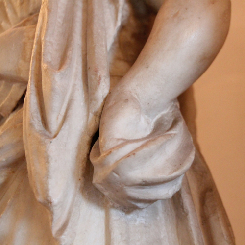 Il braccio destro, probabilmente di restauro, è piegato in vita a trattenere la veste, mentre il sinistro è steso lungo il corpo da appoggiare la mano sulla relativa anca.