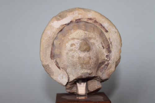 Stautetta di cui si conserva solo la testa, formata dall'unione di tre singole parti ottenute a stampo. La figura di San Menas è rappresentata in forma essenziale e stilizzata, con i tratti somatici resi in modo grossolano: il naso è grosso, la bocca è definita dalle labbra appena abbozzate mentre gli occhi sono grandi e marcati da vistose arcate sopracciliari; i capelli presentano una acconciatura a "giro di boccoli". La testa è incorniciata da un grande nimbo, costituito da una striscia di terracotta sagomata e appiattita sul lato frontale mentre sul retro è arrotondata. Tra i capelli e il nimbo sono ancora presenti tracce di colore rosso.
