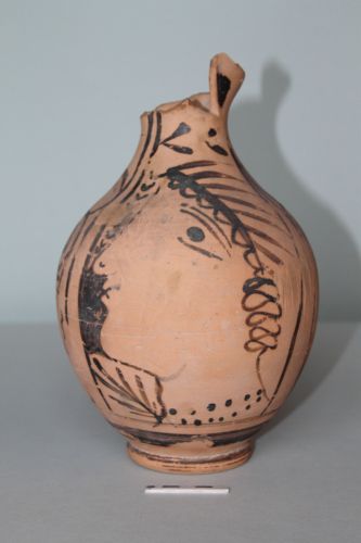 Oinochoe alto-adriatica a figure rosse in argilla giallo rosato con vernice bruna. Il vaso presenta un corpo ovoidale, piede a tondello, è mancante della bocca trilobata e di ansa. Sotto l'ansa vi è disegnata una grande palmetta a ventaglio con girali e volute laterali e palmette a pettine; sul collo, motivo a tralcio di foglie stilizzato; al centro, tra doppie linee verticali, profilo femminile volto a sinistra con corona radiata, ciocche a semicerchio sfuggenti, collana a due fili. Davanti al naso e sotto il mento, motivo di rametti stilizzati. Zona tra il naso e il mento verniciata in scuro come anche il piede. Il disegno del profilo è disorganico, quasi sfatto e trova confronti convincenti, più che nell'ambiente spinetico, in quello di Adria, dove si trovano vasi che sembrano uscire dalla stessa officina.