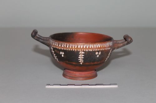 Coppa ansata apula dello stile di Gnathia in argilla giallo chiaro con ingubbiatura rosa scuro e vernice nera opaca, in gran parte marrone rossiccio per difetto di cottura. La decorazione è in bianco. Il vaso presenta corpo emisferico a pareti sottili, anse a bastoncello retroflesse, piede troncoconico cavo a profilo modanato. A risparmio il collo del piede che presenta un ingobbio in rosa scuro. Sul lato A: sotto l'orlo vi sono una serie di ovuli bianchi delimitati sopra da una e sotto da due linee incise; segue una serie di puntini da cui scendono tre tralci con doppia serie di foglie d'edera, alternati a due gruppi di tre cerchietti. Sul lato B: sotto l'orlo, doppia serie di foglie di edera separate da una linea incisa. La decorazione è molto semplice ma sapientemente disposta sul lato principale. Si tratta di un'opera che pur rientrando nella tradizione del Gruppo do Konnakis è attribuibile alla produzione minore del Pittore della Rosa. E' databile al terzo venticinquennio del IV secolo a.C.