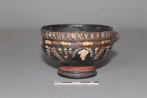 Coppa ansata apula dello stile di Gnathia in argilla beige rosato con ingubbiature rosa scuro e vernice nera opaca. La decorazione è in bianco-crema, giallo e rosa-vino. Il vaso presenta corpo emisferico e piede troncoconico cavo a profilo sagomato. Il collo del piede e la striscia corrispondente all'interno sono a risparmio. Sul lato A: sotto l'orlo una serie di ovuli in bianco a contorno inciso, compresi tra una linea sopra e due sotto pure incise, una grande foglia di vite (o grappolo?) in bianco e giallo inquadrato da tenie, con a sinistra tre gruppi formati da un cerchio maggiore e da tre minori riempiti di bianco e a destra un gruppo simile più grande; ai lati di questi, due rametti discendenti per parte, quelli esterni di foglie di edera, quelli interni di foglie di forma più arrotondata. Sul lato B: sotto l'orlo una doppia serie di foglie di edera in bianco nascenti da due linee orizzontali incise. Incrostazioni e screpolature diffuse. E' databile tra il 330-320 a.C.