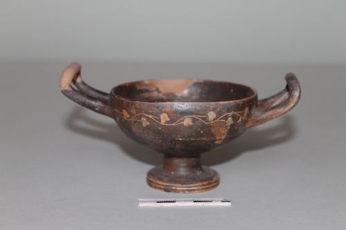 Piccola kylix dello stile di Gnathia in argilla giallo-rosa e vernice bruno opaco. Decorazione in bianco crema. Il vaso ha corpo emisferico, anse a bastoncello retroflesse, piede a tre dischi sovrapposti con basso stelo cilindrico. Fondo cavo. Sono presenti segni di strumento sullo stelo. Da ambo i lati vi è un tralcio inciso da cui escono foglie cuoriformi alternate a gruppi di tre puntini in bianco. La piccola kylix di Torcello trae le sue origini direttamente dalle kylikes greche. La datazione è indicativa alla fine del IV-III secolo a.C. e come anche il luogo di produzione, nell'Italia meridionale, non è maggiormente precisabile.