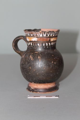 Oinochoe apula a bocca rotonda dello stile di Gnathia in argilla giallo chiaro con ingubbiatura rosso vino e vernice nera opaca. Decorazione in bianco e bianco-crema. Il vaso ha: collo alto e dritto, leggermente svasato; ansa a nastro spesso; corpo sferoidale; breve stelo su piede a doppio disco. Il collo del piede e il fondo sono risparmiati. Sull'orlo corrono tre fasce di motivi suddivisi da tre doppie linee incise; dall'alto: ovuli in bianco, tralcio ondulato a puntolini con cerchietti alternati sopra e sotto in bianco-crema, foglie d'edera i bianco allineate a punta in giù. Il vaso è mancante di alcuni frammenti dell'orlo e la vernice nera è in gran parte screpolata. Questo tipo di oinochoe a bocca rotonda si trova già nello stile di Gnathia antico con corpo arrotondato. Il profilo del vaso di Torcello è ancora piuttosto regolare, con una giusta proporzione tra collo e corpo. Una certa trascuratezza nei particolari e la qualità scadente della vernice e la scelta dei motivi decorativi fanno datare il vaso non prima degli ultimi anni del IV secolo a.C.