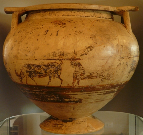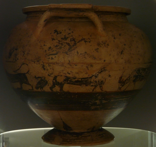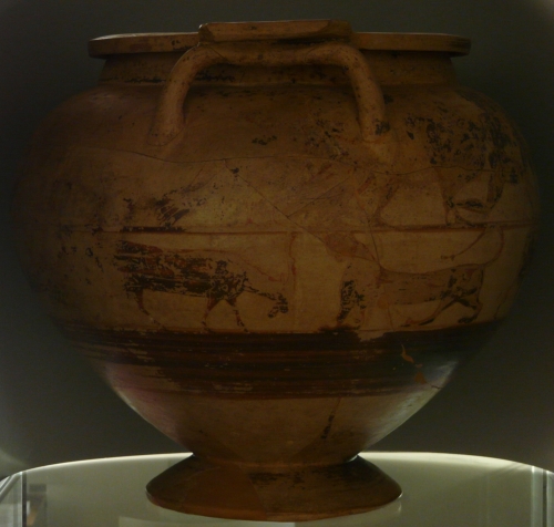 orlo piatto con placche sporgenti sopra le anse a colonnette, breve collo, spalla arrotondata e ventre emisferico fortemente rastremato verso il basso con piede troncoconico cavo. Argilla color camoscio - giallo; vernice bruno scuro opaca con tocchi di rosso paonazzo; utilizzo di linee incise per sottolineare il contorno delle figure e di alcuni particolari. La vernice bruna copre interamente l'interno dell'orlo, il collo e il piede, mentre disegna una catena di fiori di loto sul piatto dell'orlo, due volatili di profilo con le ali spiegate sulle placche sopra le anse e una sfinge alata e due volatili, uno grande e uno piccolo, intento a lisciarsi il piumaggio, sotto le anse. Tra le anse, la complessa decorazione è costituita da:
