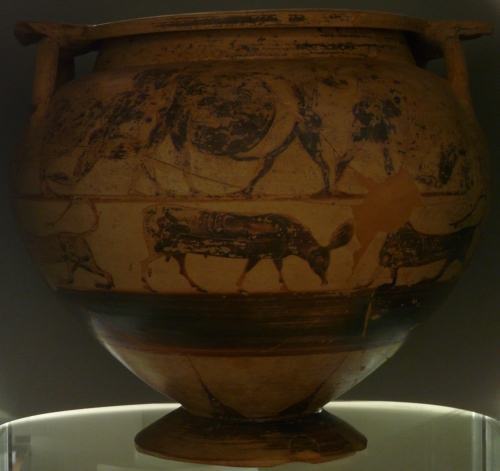 a) una scena di battaglia tra guerrieri armati con elmo, scudo e lancia, dotati di cintura e schinieri, tutti ignudi, tranne il quarto da sinistra che indossa una clamide dai bordi decorati. Da sinistra verso destra: guerriero armato di scudo, incede verso destra trafiggendo con la lancia un nemico caduto in ginocchio che volge all'indietro il capo coperto di elmo e solleva a difesa lo scudo imbracciato; al centro, due guerrieri stanti si affrontano con la lancia imbracciando gli scudi; a destra, gruppo identico a quello di sinistra.