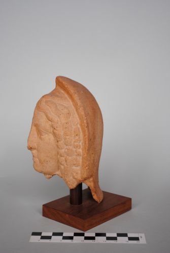 Mezza testa femminile velata, lacunosa al naso e collo. Testa volta di profilo a sinistra. Viso allungato e pieno, con grandi occhi dalle pupille incise e palpebre cordonate; labbra appena dischiuse. I capelli sono spartiti sulla fronte in bande ondulate e scendono a boccoli ai lati del viso. Velo rialzato. Retro appiattito. Terracotta arancione.