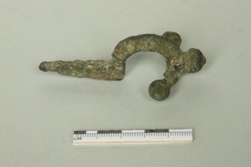 braccio trasversale chiuso dai due bottoni laterali, arco semicircolare a sezione rettangolare terminante nel bottone centrale a forma di testa di cipolla profilato; piede decorato da tacche incise (?)