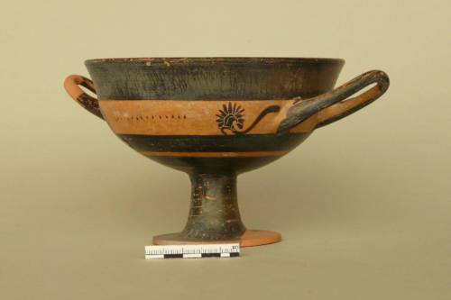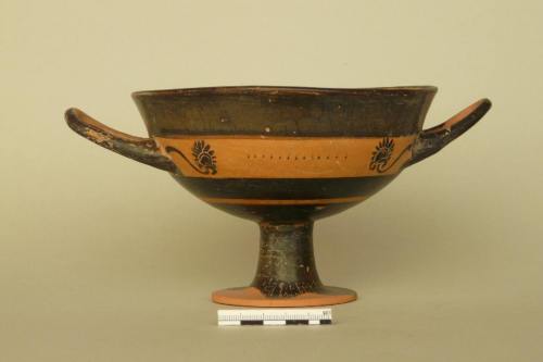 orlo convesso leggermente distinto dal corpo; vasca profonda, piede a disco con alto stelo cavo e anse orizzontali a bastoncello rialzate. A risparmio: striscia all'interno dell'orlo e tondo sul fondo della vasca con cerchio iscritto e punto nero al centro; pannello e interno delle anse e striscia all'attacco dello stelo. Interno del piede risparmiato, ma non ingobbiato. Nella zona tra le anse, da entrambe le parti, ai lati due palmette con petali incisi e cuore rosso paonazzo collegate all'attacco dell'ansa da girali. Tra le palmette, falsa iscrizione resa a puntolini irregolari