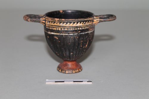 Skyphos apulo dello stile di Gnathia in argilla giallo rosato con ingubbiatura rosso vino e vernice nera opaca. Decorazione in bianco-crema. Il corpo ha vasca profonda con pareti rastremantesi verso il piede; anse orizzontali a bastoncello; verso il basso il corpo si innesta sul piede con una breve modanatura; il piede è formato da un breve stelo che si inserisce in un anello troncoconico dal bordo superiore concavo. Il fondo è cavo. Il collo del piede e il fondo sono risparmiati. La baccellatura è verticale profonda e regolare sul corpo desinante verso l'alto ad archetti incisi . Sull'attacco delle anse, false bacellature in colore bianco. Tra le anse: doppia linea continua, seguita da motivo ad onda e fila di punti tra linee continue. Sull'orlo del piede, kyma dorico alternato a fiori di loto rovesciati. Vi sono piccole sbrecciature sull'orlo e screpolature alla venice nera. Il piccolo skyphos di Torcello ha pareti sottili e forma elegante. La forte rastremazione delle pareti verso il basso, indica una datazione piuttosto tarda, agli ultimi del IV o nel primo quarto del III secolo a.C.