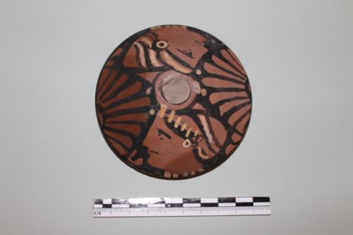 Coperchio di lekanis con labbro quasi verticale, spalla leggermente convessa su cui si impostava il pomello di presa a breve raccordo cilindrico, andato perduto.