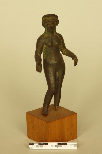Venere stante, nuda, con la gamba destra leggermente flessa, scostata e avanzata. Il braccio destro è flesso e proteso, con il palmo rivolto verso l'alto a reggere un attributo oggi mancante (di solito un pomo o, più raramente, un piccolo recipiente per profumi). Il braccio sinistro è in probabile posizione di appoggio su un sostegno laterale (il sostegno è quasi sempre necessario in queste statuine di Venere a causa dello sbilanciamento delle gambe) e la mano, rivolta verso il basso, è in atto di stringere, forse, un altro attributo perduto. La testa, leggermente volta a destra, è ornata da un diadema decorato a semicerchi incisi accostati. I capelli, con scriminatura centrale, sono disposti a corona sulla fronte e sulle tempie e sono raccolti sulla nuca in una crocchia da cui scendono sul collo e sulle spalle due coppie di trecce in posizione simmetrica. Il volto ovale ha gli occhi segnati da due piccoli incavi circolari, naso irregolare e bocca indicata da un solco.