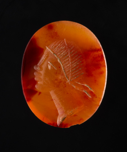 Corniola di forma ovale piana con incisa una testa femminile di profilo a sinistra, con nastro passante sulla fronte e a metà testa (due giri, il secondo più sottile), i cui estremi pendono liberi sul collo. I capelli sono raffigurati tramite sottili linee verticali e parallele. Da notare il collo allungato, su cui la testa si protende, col mento leggermente sollevato. Caratteristici i tratti somatici, con il naso diritto, le grosse labbra, rese da due spessi tratti paralleli e l'occhio sormontato da il sopracciglio assai marcato.