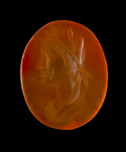 Corniola rossa di forma ovale piana/piana con incisa una testa maschile di profilo a sinistra, con corona vegetale, comprendente il collo e l'attacco del busto, con panneggio. I capelli sono lavorati a grosse ciocche; la corona, probabilmente d'alloro, è resa con pochi grossi tratti diagonali che partono da una sorta di nastro centrale, annodato dietro la nuca. Da notare la rappresentazione della bocca, costituita da due grossi e brevi tratti paralleli. L'incisione, lavorata a solchi grossi, è sommaria; mancanza di dettagli.