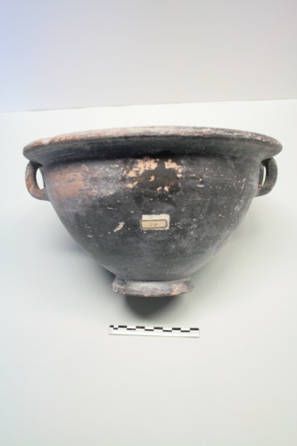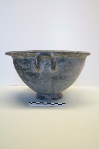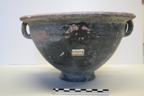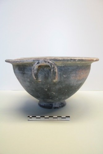 Cratere a vernice nera in argilla giallo-arancio e vernice grigio scuro opaco con zone rossastre per difetto di cottura. Il cratere presenta una vasca larga e profonda a breve orlo esoverso con anse a bastoncello ripiegate e rivolte verso l'alto fino a saldarsi alla parte inferiore dell'orlo. La parete si rastrema fortemente verso il piede troncoconico cavo. Il fondo è verniciato, ma di colore rossastro. Il cratere è mancante di una larga parte dell'orlo. La vernice è screpolata e sono diffuse le incrostazioni. Questa forma si trova in Attica già nel tardo V secolo tra i tipi della ceramica semi-verniciata e anche nella ceramica acroma di Corinto. La forma di questi esemplari è molto simile a quella di Torcello, ma questo vaso presenta però una verniciatura interna grigio scuro. Un esemplare di Adria, datato al III-II secolo a.C., potrebbe testimoniare la trasmissione del tipo in Occidente e in particolare in questa zona della Valle Padana. Al III-II secolo a.C., non prima, per la qualità scadente della vernice e il colore tendente al grigio scuro, si potrebbe datare anche l'esemplare di Torcello.