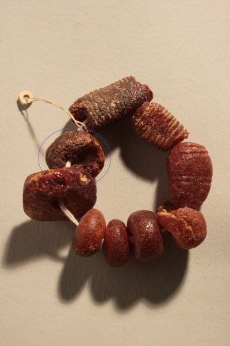 Perla lievemente scheggiata, conformata a disco. Si tratta di manufatto atipico e documentato in varie fasi dell'età del ferro e anche in età romana.