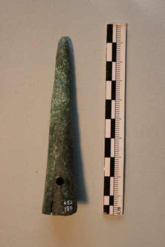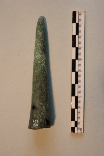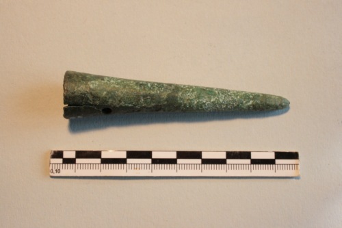 Punta di lancia in bronzo con patina verde chiaro. La lancia è a sezione cilindrica, rastremantesi verso il basso; sotto il bordo vi sono due fori simmetrici passanti. L'esemplare di Torcello trova confronto con un manufatto della stessa foggia da Marsiliana d'Albenga in Etruria.