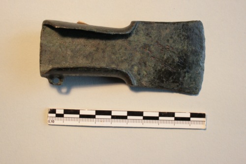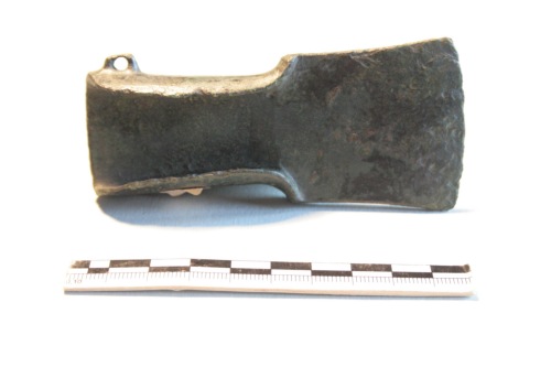 Ascia di piccole dimensioni ad alette con occhiello laterale. La lama dell'ascia è subtrapezoidale alquanto tozza, a margini quasi diritti; le spalle sono larghe e marcate, pressoché orizzontali; le alette sono spesse e poco rientranti; l'occhiello laterale è appiattito. Si tratta di un tipo attestato in Trentino-Alto Adige e in Veneto nella prima età del ferro. La superficie presenta una patina verde scuro.