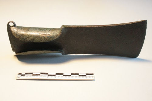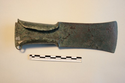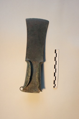 Grande ascia ad alette con occhiello laterale. Lama di forma subtrapezoidale, alquanto slanciata e margini lievamente concavi; brevi spalle assai marcate, alette strette a contorno ellittico. L'ascia ad alette con occhiello laterale è diffusa in Italia centro-settentrionale nella prima età del ferro. Nello specifico l'ascia da Torcello trova confronto con un tipo documentato nel Veneto centro-orientale, principalmente nel territorio atestino e nel Trevigiano. Per confronto con un esemplare dalla tomba 13 della necropoli di Casa Alfonsi l'ascia da Torcello può essere riferita ad un arco cronologico compreso tra il secondo e il terzo venticinquennio del VI secolo a.C.La superficie è caratterizzata da una patina verde scuro.