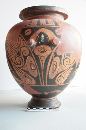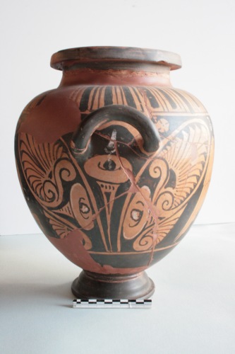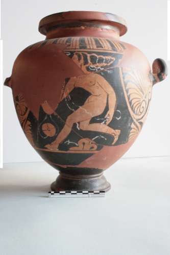 Stamnos etrusco a figure rosse in argilla rosata con ingubbiatura arancio chiaro e vernice nera a riflessi metallici. Il vaso è composto da un orlo rovesciato all'esterno, breve collo, anse orizzontali a bastoncello retroflesse, corpo ovoide, piede campaniforme cavo a profilo sagomato. Sulle spalle è presente un motivo ad imbuto formato da trapezi allungati scanditi da doppie linee verticali, che alternativamente si fermano sopra o raggiungono la linea di base; il lato inferiore dei trapezi è concavo. Sotto le anse, tre fiori campanulati con aggiunte di bianco, che si sviluppano ai lati delle anse in grandi palmette a ventaglio incorniciate e in palmette a pettine più piccole. Sopra le anse, due dischi con motivo cruciforme all'interno. Sul lato a):donna ignuda con alti calzari in corsa verso sinistra; porta acconciatura a coda di cavallo stretta in più punti da nastri, collana ed orecchini e da un braccio all'altro passano sottili tenie bianche che scendono da un oggetto dalla base arrotondata, oggi non più leggibile, retto nella mano destra. Nel campo è presente un disco e, sulla linea del terreno, un motivo a foglie da cui escono dei virgulti in colore bianco. Sul lato b):grande uccello ad ali spiegate di profilo verso sinistra; le penne delle ali e della coda sono disegnate minuziosamente. Dal becco pendono sottili e lunghe tenie in colore bianco. A risparmio l'interno e il pannello delle anse, la parte inferiore del collo e il fondo del piede. Ricomposto da più frammenti e reintegrato nelle lacune del collo, spalle e corpo. I motivi decorativi fanno inserire il vaso nel gruppo "Funnel Group".