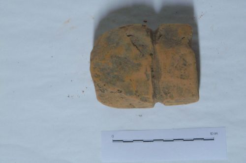 peso da telaio costituito da un rozzo blocchetto di terracotta poliedrico, nel quale è ben visibile il solco lasciato dalla legatura del filo