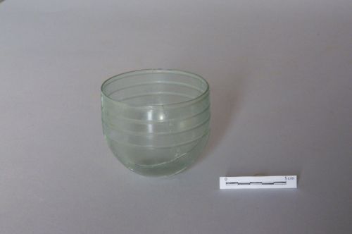 parete diritta, orlo a margine appena distinto, labbro dritto, tagliato e polito alla mola, vasca ovoide, fondo indistinto leggermente concavo esternamente; vetro incolore con parete esterna segnata da linee incise alla mola