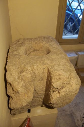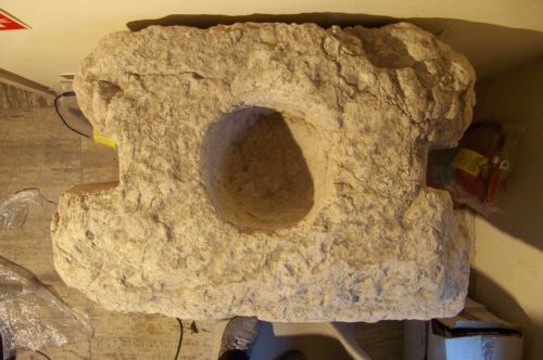 grosso blocco di pietra sbozzata, con incavo emisferico sulla superficie e due grossi incassi laterali