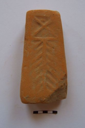 peso da telaio troncopiramidale, con base rettangolare e foro pervio sulla sommità, con faccia anteriore decorata da motivo a spina di pesce sormontato da una X