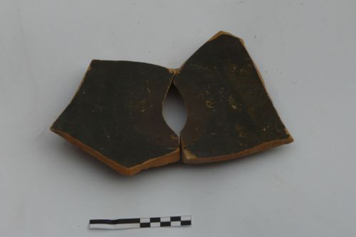 orlo diritto indistinto e piede ad anello; impasto depurato, morbido, molto farinoso al tatto, con evidenti cambi di colore ed è caratterizzato dalla presenza sia di vacuoli sia di inclusi micacei; vernice coprente di colore nero opaco, caratterizzata dalla presenza sul fondo interno del disco di impilamento rosso bruno. Fondo esterno risparmiato