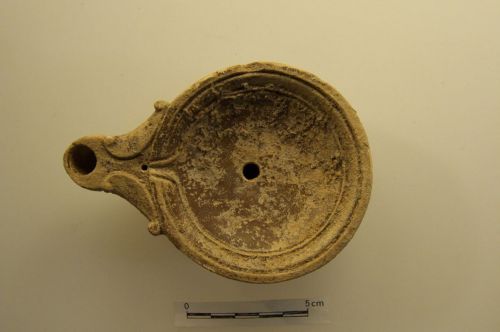 serbatoio troncoconico rovesciato, spalla leggermente inclinata verso l'interno decorata da due solcature concentriche e due cordoli interrotti in corrispondenza del becco da un corto canale in cui è aperto un forellino di sfiato. Il disco, concavo, non è decorato ed ha al centro l'infundibulum. Becco a ogiva e volute doppie solo disegnate. Base leggermente concava. Tracce di vernice rossa sull'impasto giallo chiaro, molto depurato.