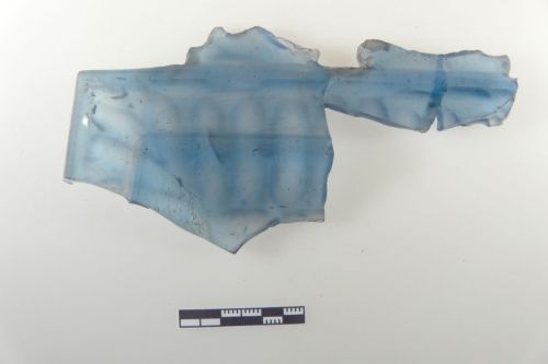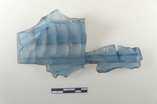 pareti basse e svasate, resti di presa orizzontale piatta, orlo a margine ingrossato, saldata sul lato breve; fondo piano con piede. Decorazione a sfaccettature su tutta la perete e il fondo esterno. Vetro blu