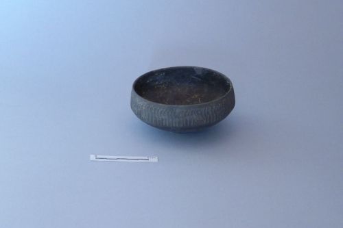 coppa carenata priva di orlo, con pareti inclinate verso l'interno e labbro sottolineato da tre sottili solcature; fondo piano. Sotto l'orlo decorazione a strigilature alla barbottina (Ricci 1985, p. 322, dec. 163)