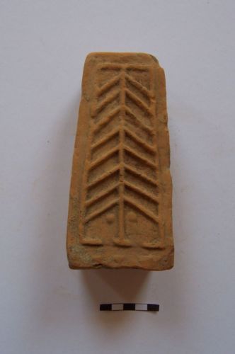 peso da telaio troncopiramidale, con base rettangolare e foro pervio sulla sommità, con faccia anteriore decorata da motivo a spina di pesce inserito in una cornice a rilievo