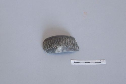 coppa carenata priva di orlo, con pareti inclinate verso l'interno e labbro sottolineato da tre sottili solcature; fondo piano. Sotto l'orlo decorazione a strigilature alla barbottina (Ricci 1985, p. 322, dec. 163)