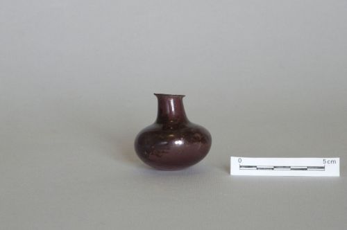 collo cilindrico sottolineato da una leggera strozzatura alla base, ventre discoidale, base piana; vetro viola