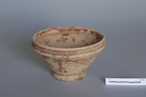 coppa conica con orlo verticale leggermente inclinato verso l'interno; attacco della parete sottolineato da una fascia decorata a rotella; piede ad anello. Al centro del fondo interno probabili tracce di un bollo non leggibile.